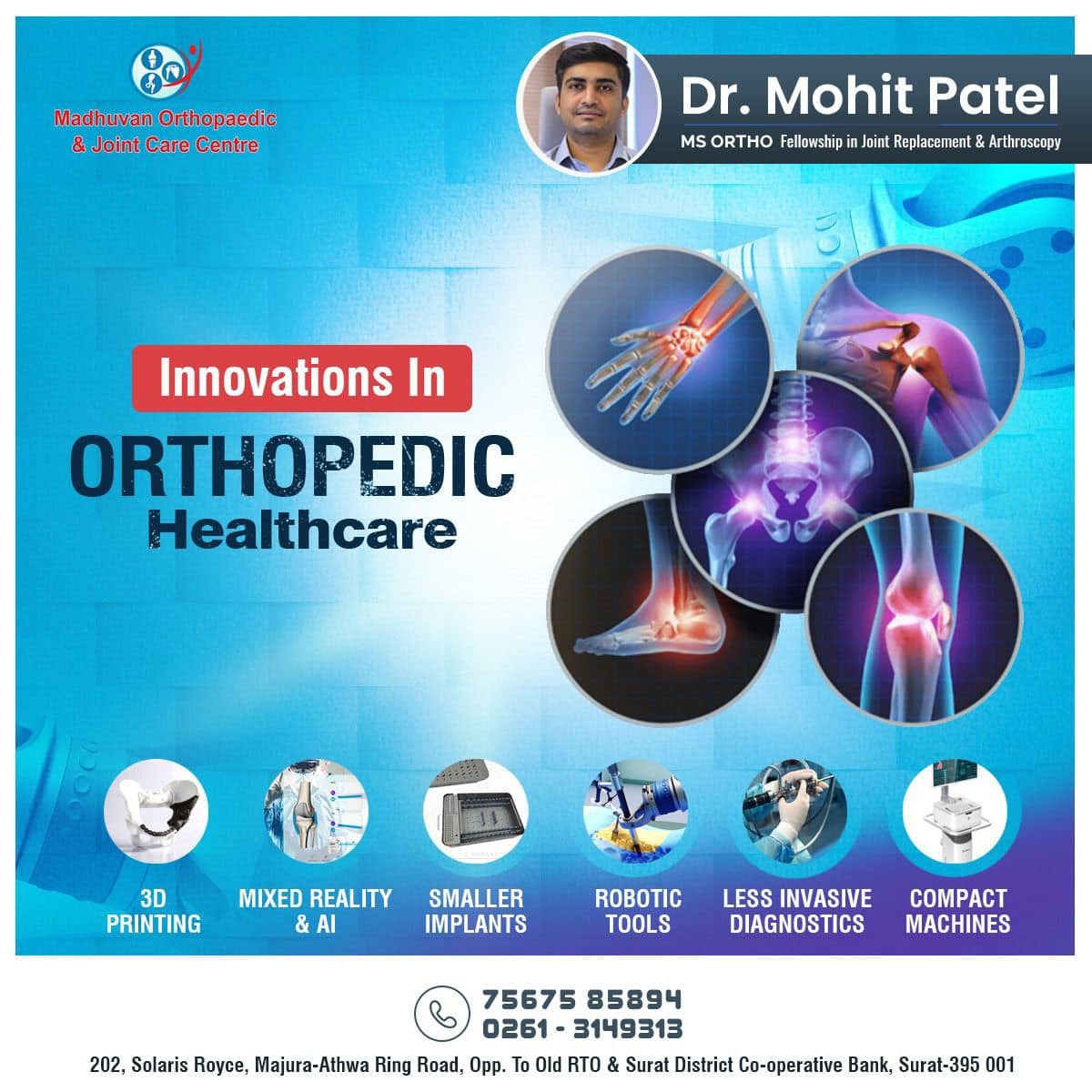 Reach out to us for the best possible solutions to all your problems! Our doctors have years of experience and their prolonged expertise has helped hundreds of patients feel better. Book an appointment now to know more! Mohit Patel Address: Madhuvan Orthopaedic & Joint Care Centre 202, Solaris Royce, Ring Road, Opp Old RTO, Athwagate. Surat For an appointment, Call: +917567585894 Follow us @drmohitpatel_surat